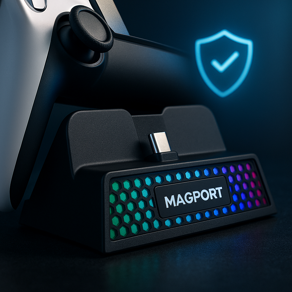 עם MAGPORT™ אתה טוען בראש שקט. התחנה מצוידת בשבב הגנה חכם שמנתק את הטעינה אוטומטית כשהסוללה מלאה. אין חשש לטעינת יתר, חימום יתר או בלאי מיותר. המגנט מצמיד בעדינות אך בחוזקה – ללא שחיקת שקע ה-USB. המכשיר שלך מוגן, הסוללה נשמרת, ואתה נהנה משנים של גיימינג ללא תקלות.