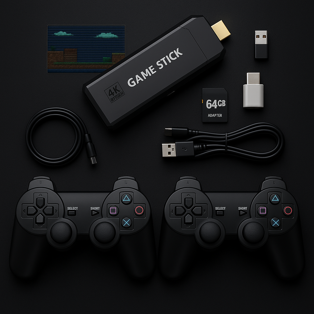 - ✔ דונגל M8 4K Game Stick – הקונסולה עצמה, קטנה וניידת, עם יציאת HDMI שמתחברת ישירות לטלוויזיה.
