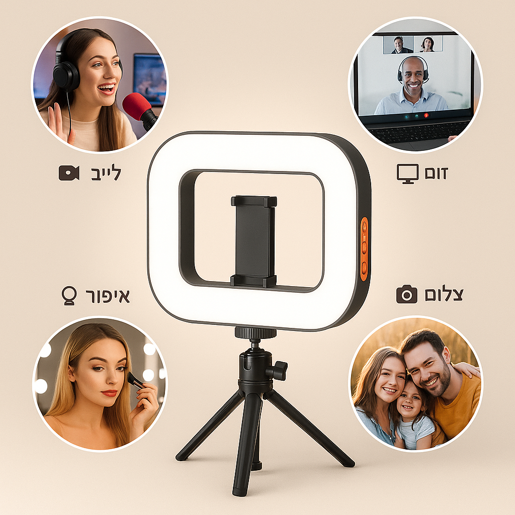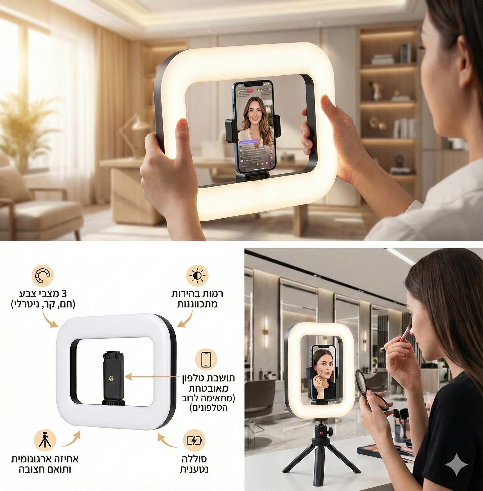 המוצר הזה נולד כדי לפתור את כל בעיות התאורה שמטריפות יוצרי תוכן ביום־יום תאורה חלשה, אור צהוב בבית, צללים מפריעים וחוסר יציבות. הוא הופך כל שולחן קטן לסט צילום מלא, בהתקנה של פחות מ־10 שניות. מחזיק הטלפון המובנה מאפשר צילום אנכי או אופקי, כך שהוא מושלם לטיקטוק, יוטיוב, אינסטגרם, זום ושיחות וידאו. התאורה המאסיבית שלו גורמת גם לאיפור להיראות מדויק בצבע אמיתי מה שהופך אותו למועדף אצל מאפרים, מדריכי ביוטי ויוצרים. הוא קומפקטי אך נותן תחושה של אולפן אמיתי, אפילו בחדר קטן. ומתוך זה שגם הראש שלו מתכוונן לחלוטין ניתן לצלם מהכל: מוצרים, פרצוף, ידיים, טוטוריאלז ועוד...
