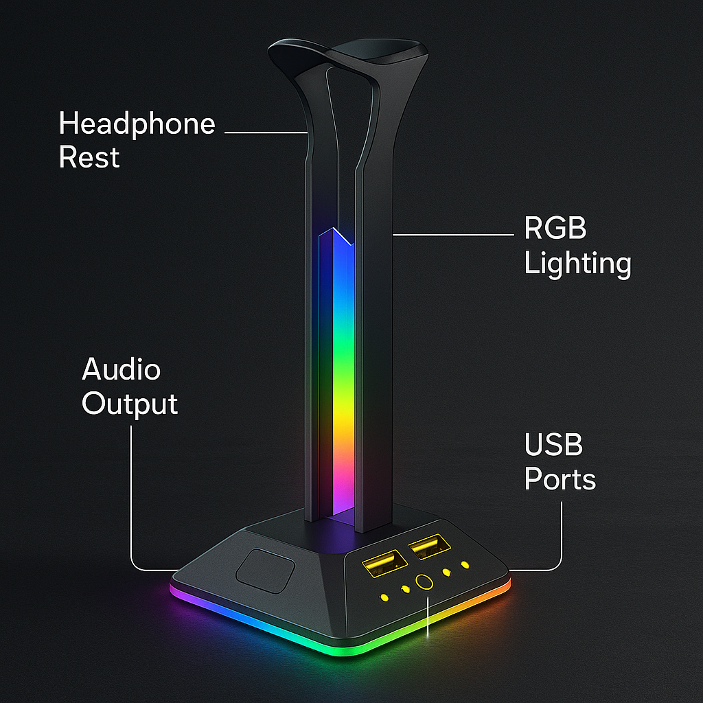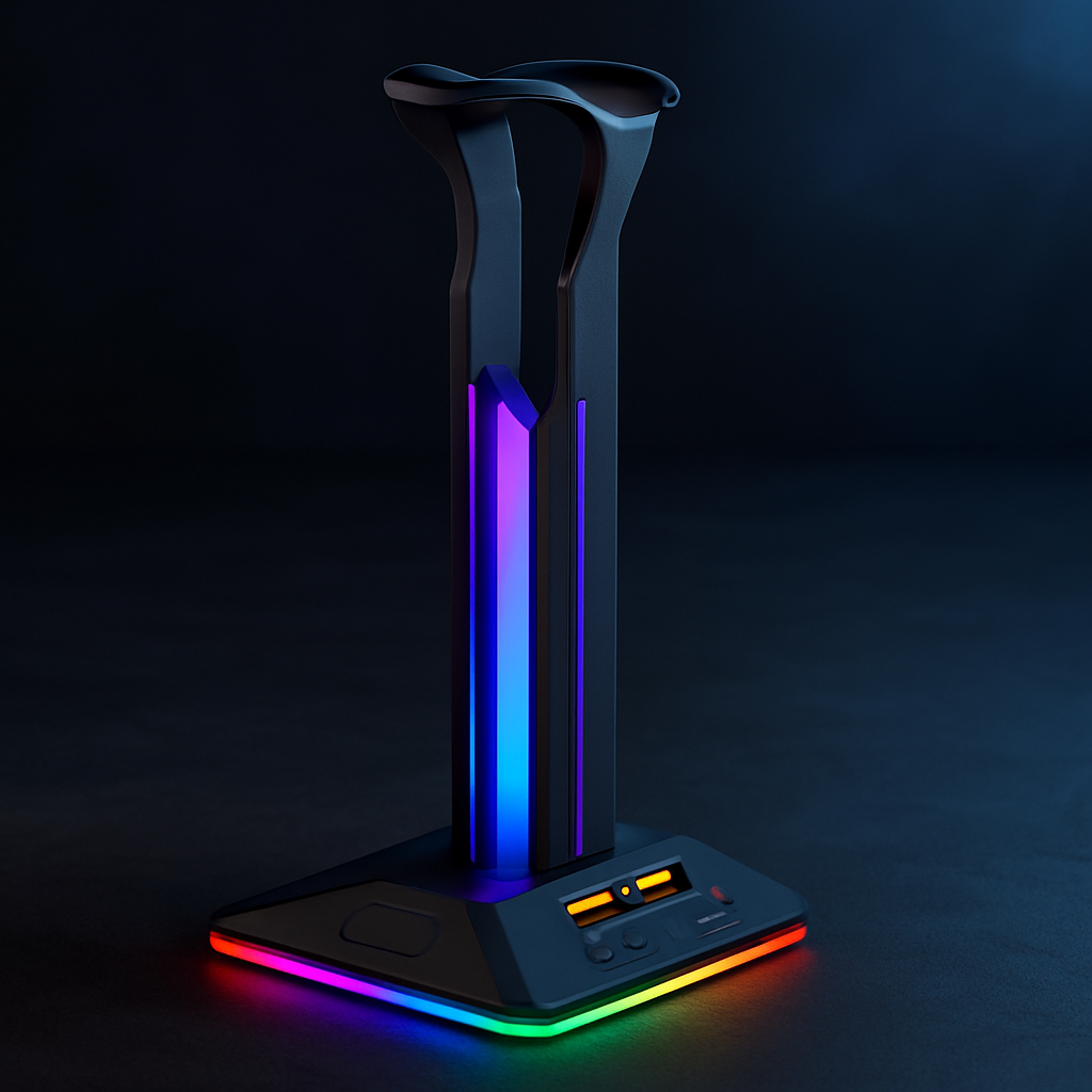 המעמד הזה לא רק מחזיק את האוזניות הוא מסדר את השולחן, מוסיף יציבות ושומר על כל הכבלים במקום, ובו בזמן מדליק את כל האווירה עם RGB עוצמתי. זה הפריט שהופך פינה רגילה ל־Setup אמיתי שמרגיש כמו חדר של סטרימר או פרו־גיימר.
