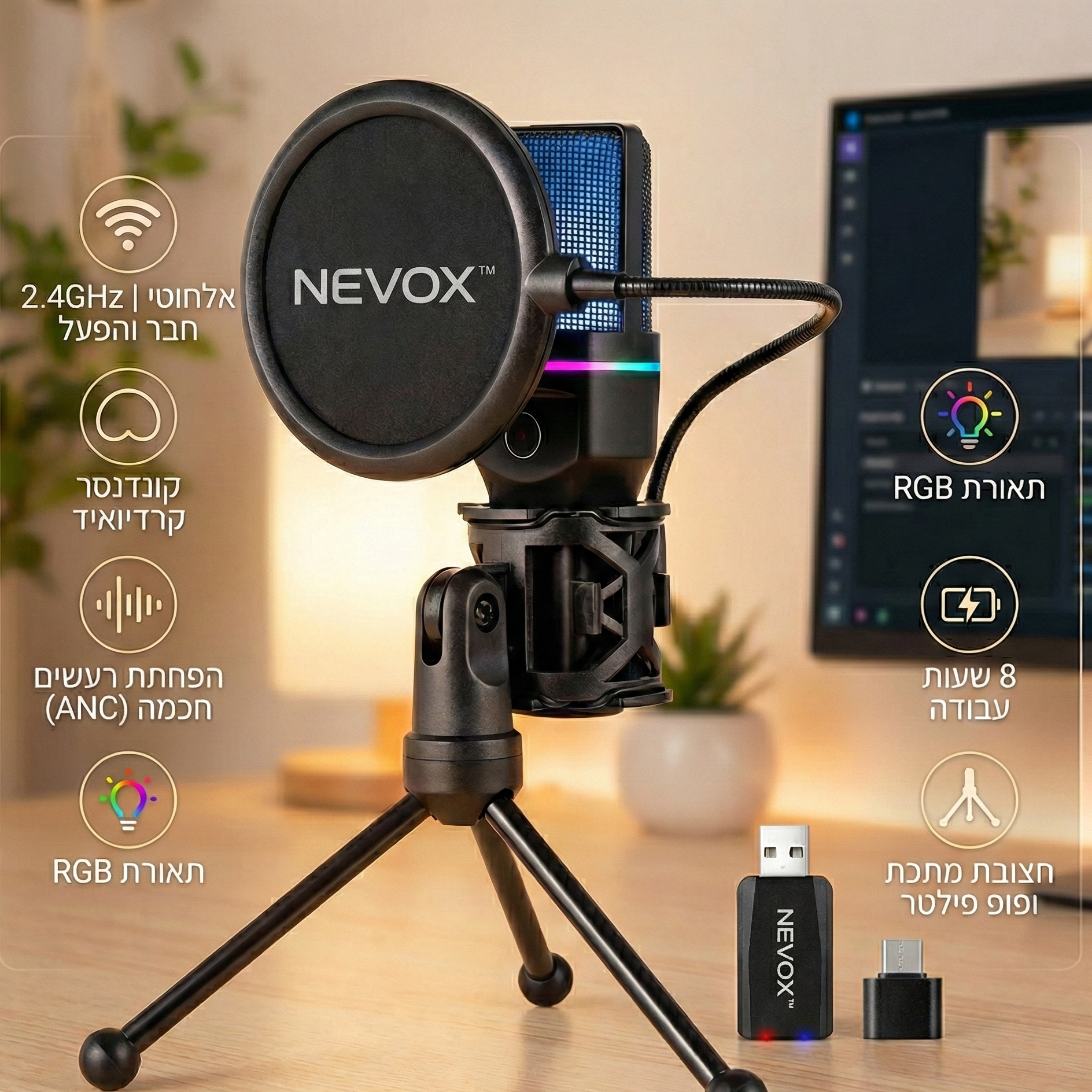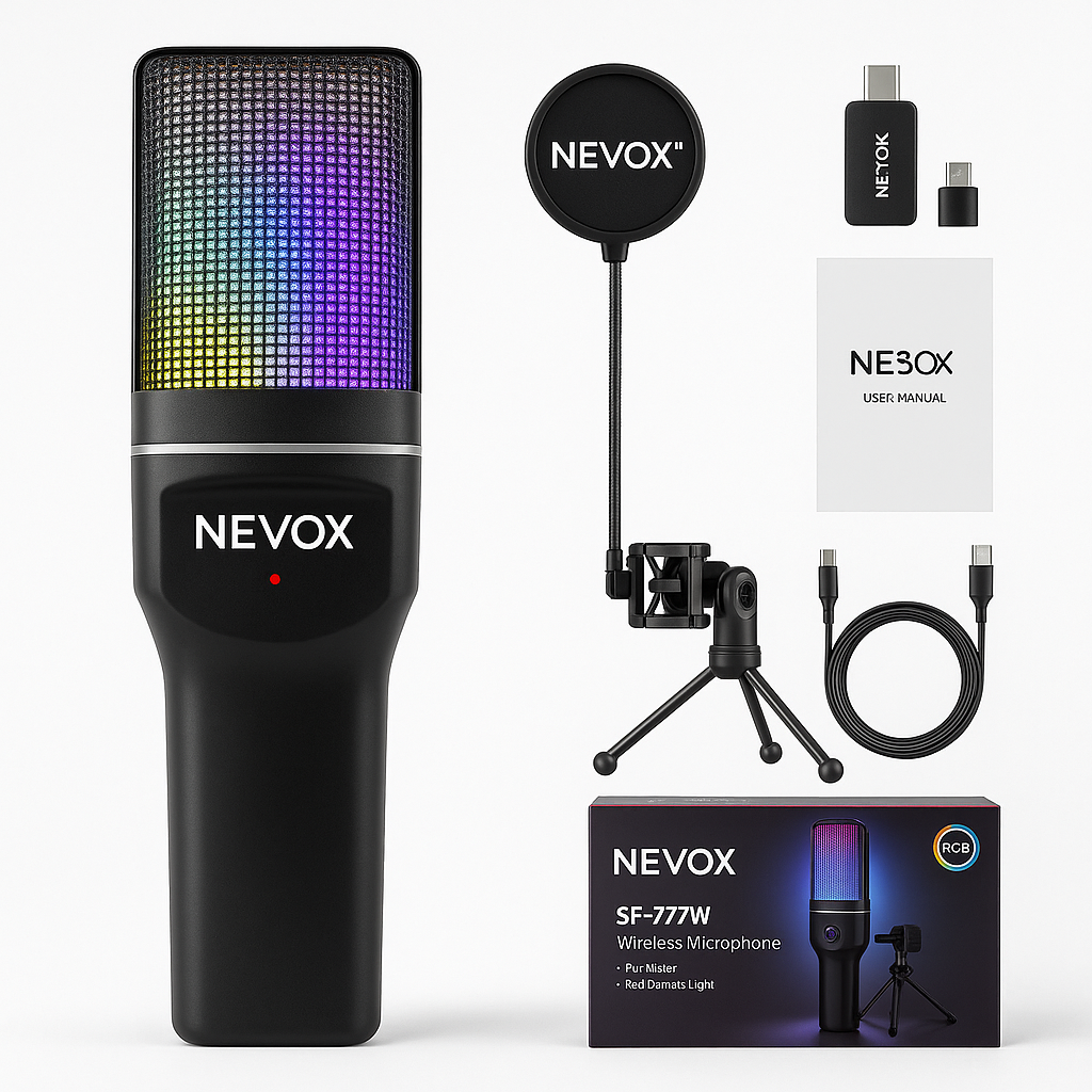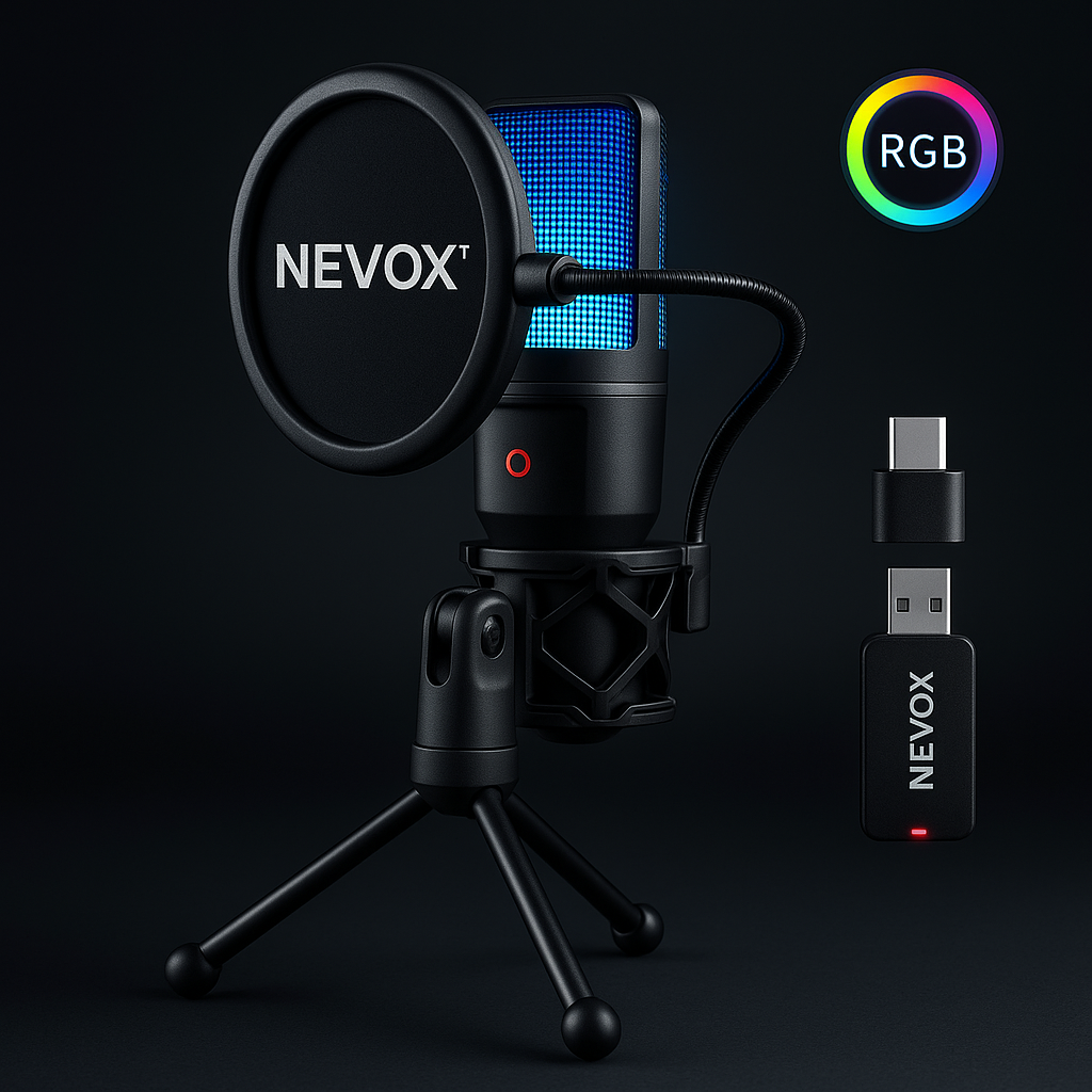 ה-NEVOX™ לא רק נשמע מקצועי – הוא גם נראה כזה. תאורת ה-RGB הדינמית מוסיפה וייב חזק לכל שידור, סרטון או עמדת עבודה, והחצובה המתכתית היציבה שומרת על המיקרופון במקום בלי רעידות ובלי נפילות. פילטר הפופ משלים את המראה ונותן טאץ’ של אולפן אמיתי. גם אתה מרגיש מקצועי יותר מול המצלמה, וגם מי שצופה בך מבין מיד שאתה לוקח את זה ברצינות.