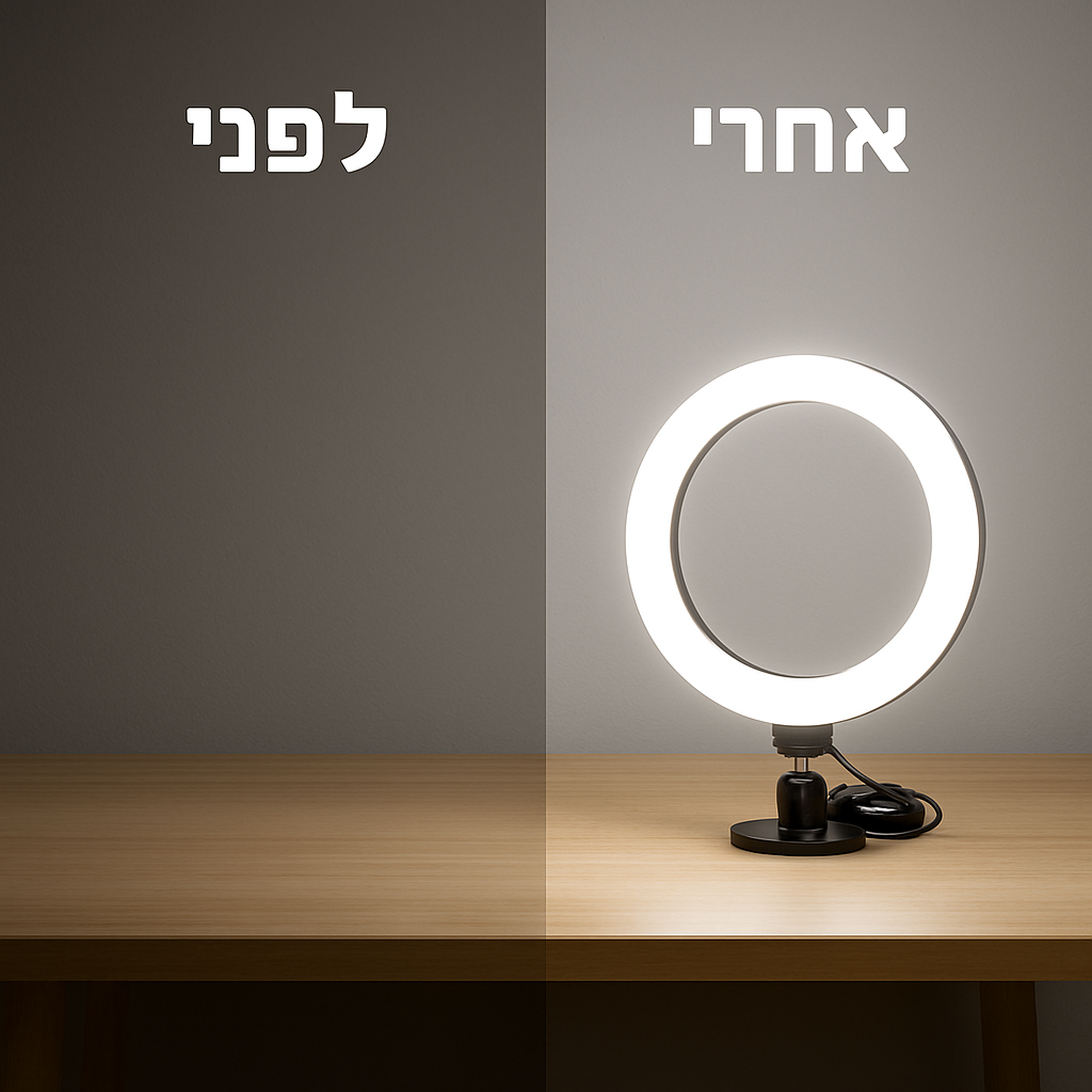 מחברים USB, מניחים על השולחן, מכוונים את הזוית — וזהו. לא חצובות ענק, לא ציוד מסורבל, לא כאבי ראש. רינג לייט קומפקטי שמוכן לעבודה תוך 10 שניות.