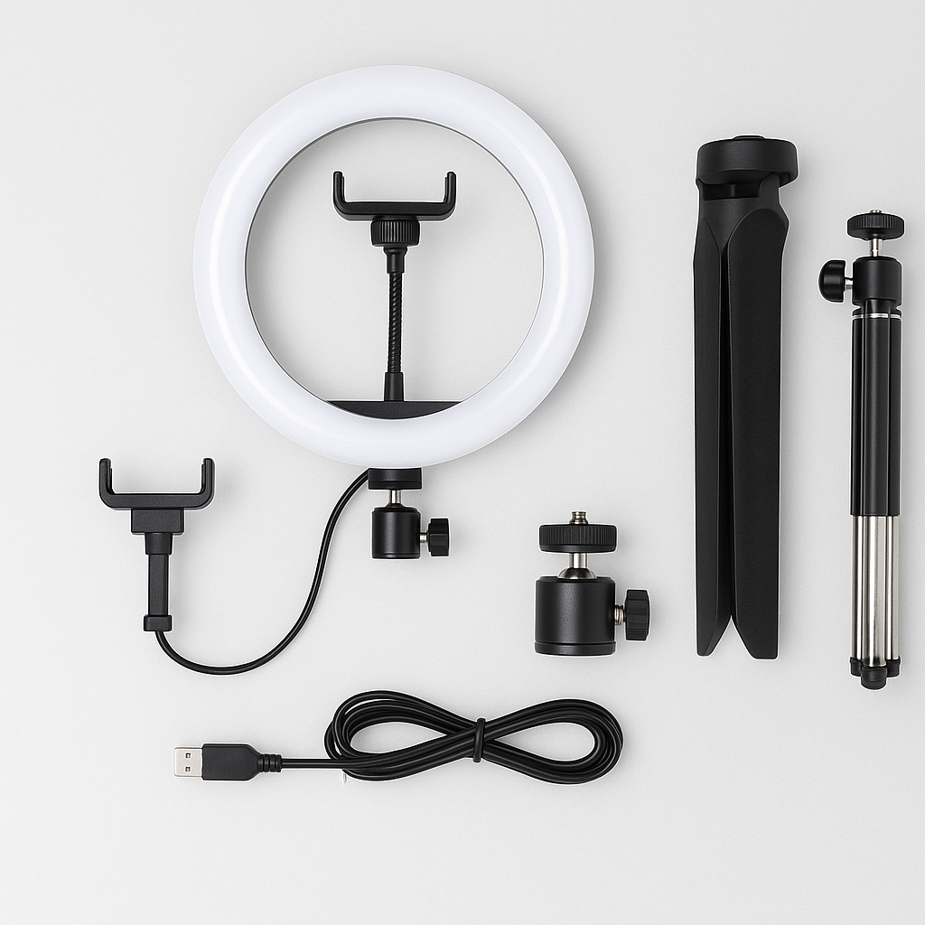 החצובה השולחנית שומרת על יציבות, המחזיק אוניברסלי, והכול נכנס בקלות לתיק. מתאים ליוצרי תוכן, מאפרות, סטודנטים ולכל מי שרוצה להיראות טוב במצלמה — בלי סיפור ובלי התארגנות.